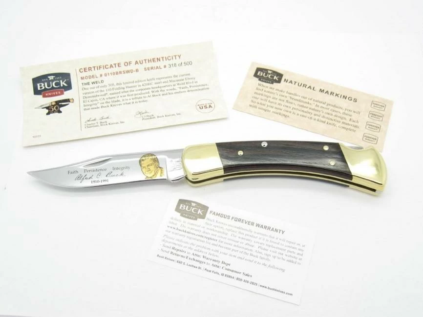 It is named after Weld Blvd in El Cajon, CA where it was first produced. With the words, “Faith, Persistence, Integrity” on the blade, it is a tribute to Al Buck and his endless determination that made Buck Knives what it is today.