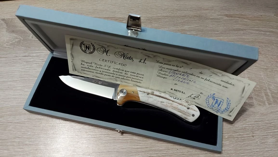 Knives made by Miguel Nieto brand originate from southeast of Spain, from Albacete town which is known for traditional production of knives since 16th century. Smith’s art was constantly devoted from father upon son. In 1980 Miguel Nieto and his sons started to create their new own models and to build up Miguel Nieto brand which is based on reliable quality gained by combination of modern Technologies with traditional craft experiences. The company still draws from family traditions and secrets of smith’s craft which was devoted from generation to generation. Nieto brand is a synonym of tradition and quality with modern design. When producing blades only a high quality Spanish steel AN-58 is used, tempered to 58-60 HRC.